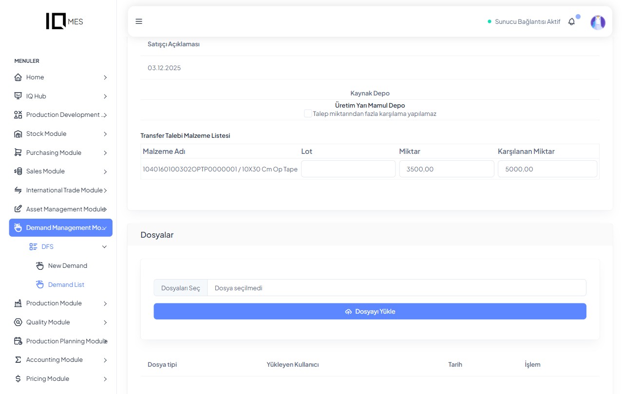 - Malzeme transfer talepleri